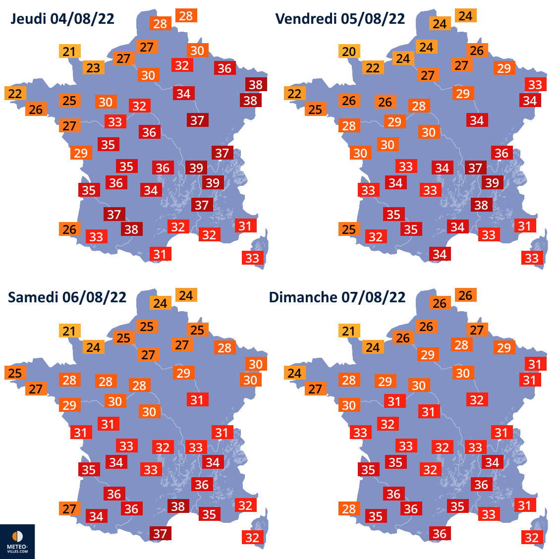 Prévisions des températures maximales du jeudi 4 au dimanche 7 août 2022 - Météo Villes