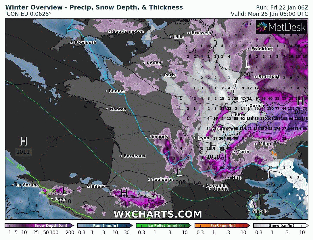 Animation des précipitations et risque de neige (blanc) entre lundi 25 et mardi 26 janvier – Modèle ICON-EU via WX CHARTS