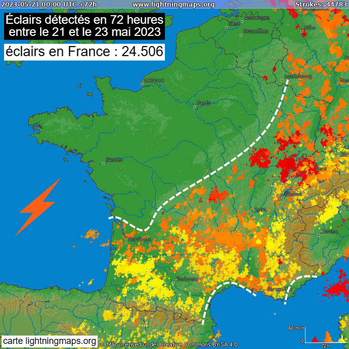 Éclairs détectés sur 72 heures entre le dimanche 21 et le mardi 23 mai 2023 - via lightningmaps.org