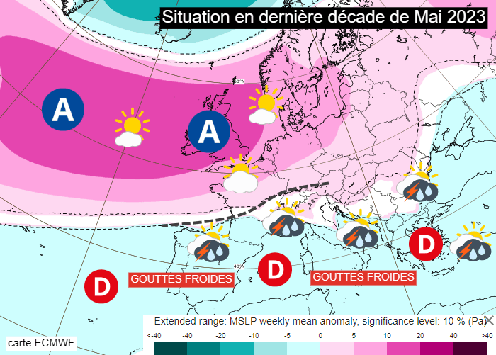 Anomalie de pression en Europe durant la dernière décade de mai 2023 - via ECMWF