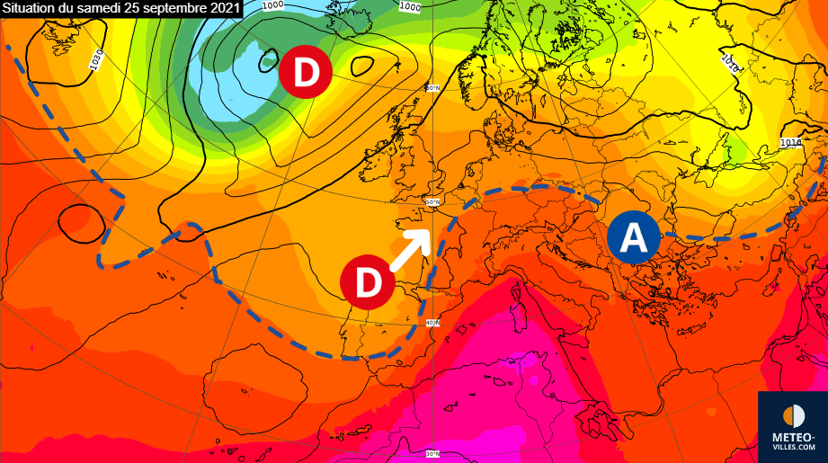 Situation atmosphérique sur l'Ouest de l'Europe ce samedi 25 septembre 2021 – ECMWF, modifié par Météo-Villes