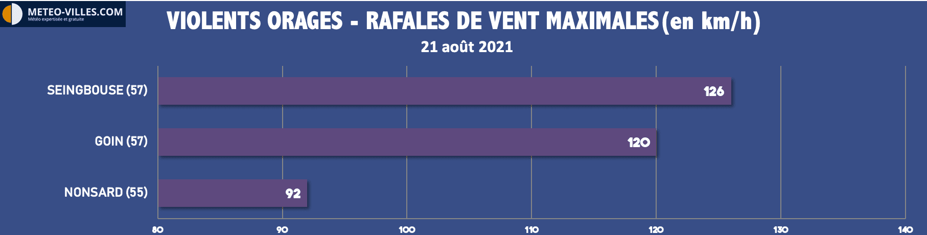 Mais les orages les plus virulents ont eu lieu du côté du département de la Moselle. Très organisés, ils ont notamment produit des rafales de vents particulièrement violentes et même destructrices au sud et à l'est de l'agglomération de Metz, dépassant les 100km/h : jusqu'à 126km/h sur la localité de Seingbouse ainsi que 120km/h sur l'aéroport Metz-Nancy-Lorraine (commune de Goin).