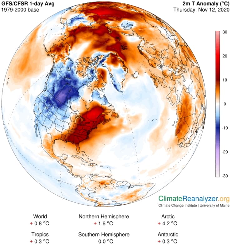 Anomalies thermiques sur l'hémisphère nord ce jeudi 12 novembre 2020 - via climatereanalyzer