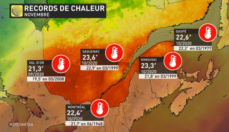 Records de chaleur pour un mois de novembre au Québec le 10 novembre 2020 - via Météo Média