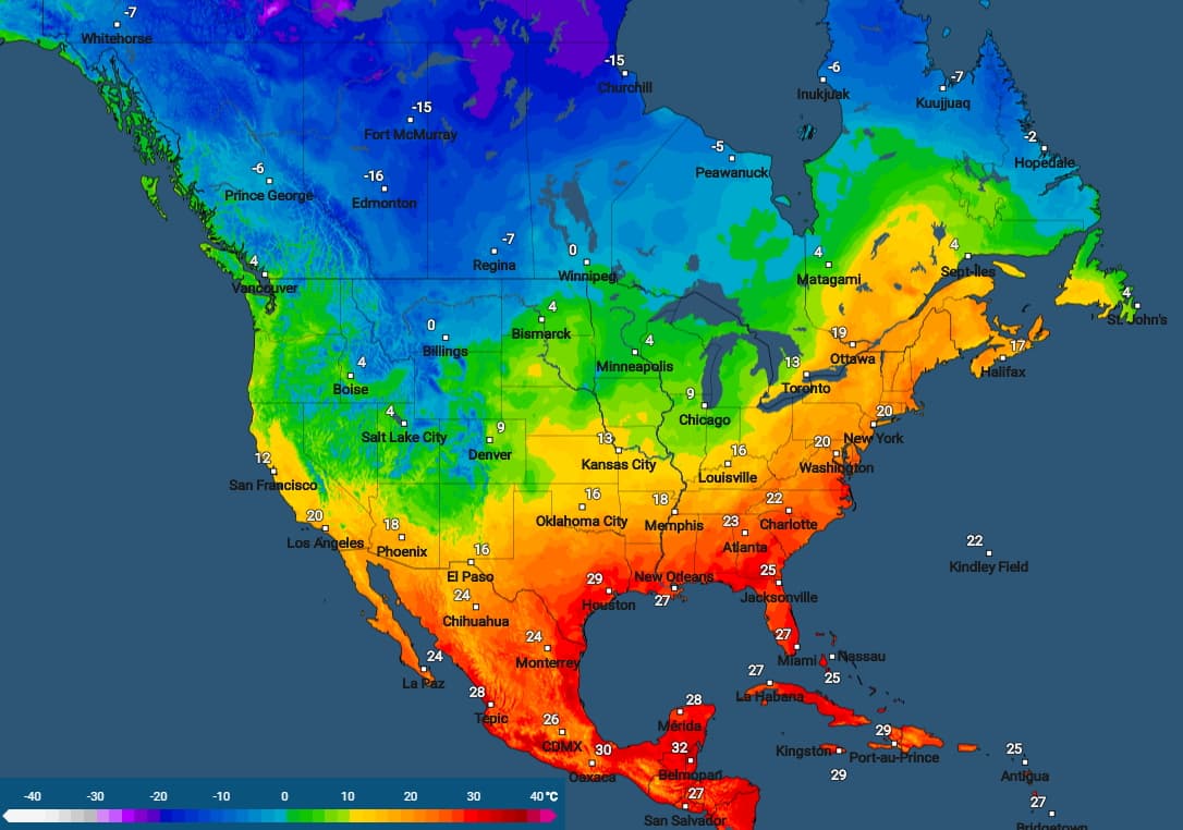 Le continent nord-américain est celui de tous les contrastes à l'heure actuelle avec des températures remarquablement douces à chaudes sur sa partie est (de la Floride à l'est du Canada) mais un froid très hivernal sur sa partie ouest. Aux États-Unis, il y a 20 à 30°C d'écart entre les états du nord-est et ceux du nord-ouest !