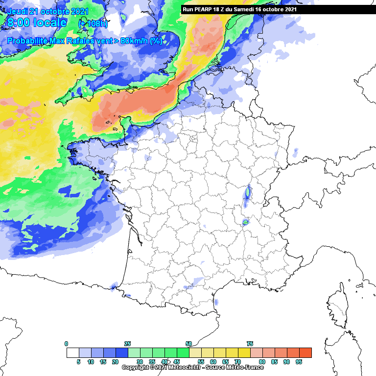 Probabilités de rafales supérieures à 80km/h et 100km/h - mercredi 20 et matinée du jeudi 21 octobre 2021 - Modèle PEArpège via Météociel