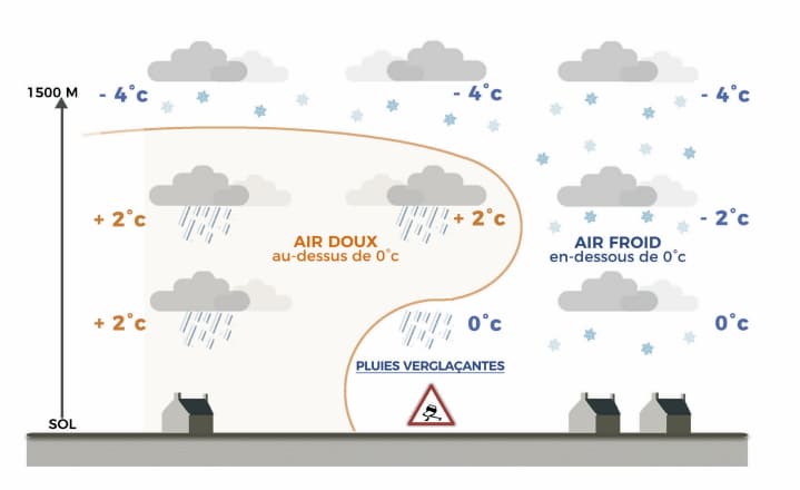 Schéma expliquant le phénomène de pluie verglaçante - via notre ouvrage Météo Extrême