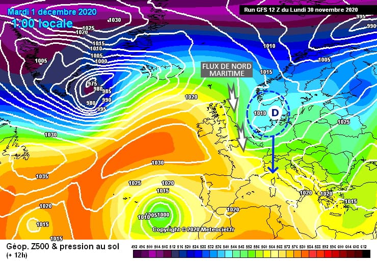 Nous étions concernés depuis la fin de la semaine dernière par un flux continental ayant apporté de l'air froid sur la France. Ce 1er décembre, le flux a basculé au nord avec l'arrivée d'une perturbation.