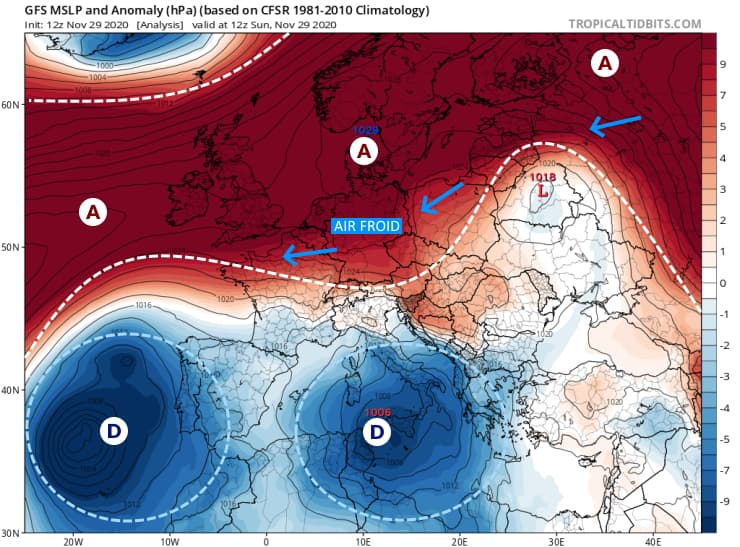 Position des centres d'action et flux dominant le dimanche 29 novembre 2020 - via tropicaltidbits.com