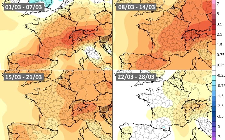 Malgré le rafraîchissement des prochaines heures, cette première semaine de mars se montre nettement plus douce que la normale. Le modèle européen envisage un retour à des valeurs plus proches des normales pour les trois prochaines semaines de mars 2021. De légères anomalies fraîches sont même modélisées pour la fin du mois en allant vers le nord-est de la France.