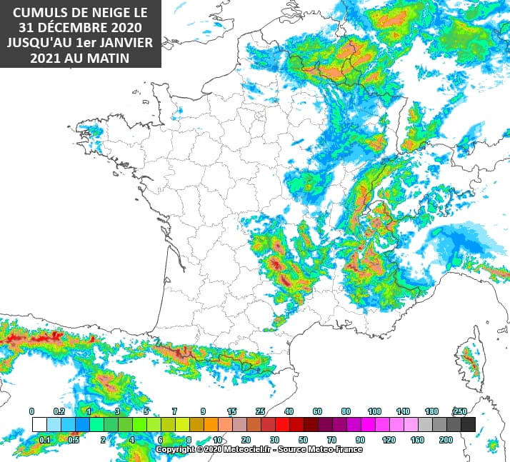 Cumuls de neige attendus pour le jeudi 31 décembre 2020 jusqu'au matin du Nouvel An - modèle AROME via meteociel.fr