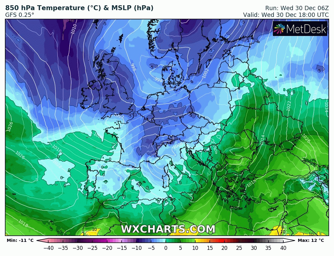 Comme l'illustre l'animation de la masse d'air ci-dessus, on constate l'arrivée d'un air de plus en plus froid au dessus de la France dès le vendredi du jour de l'An ainsi qu'au cours du week-end des 2 et 3 janvier 2021. Les températures vont alors s'abaisser entre -5 et -8°C en moyenne à 850 hPa (vers 1500m), des niveaux très hivernaux et propices aux précipitations sous forme solide jusqu'en plaine. On constate même des valeurs de -10°C sur la moitié nord le lundi 4 janvier.