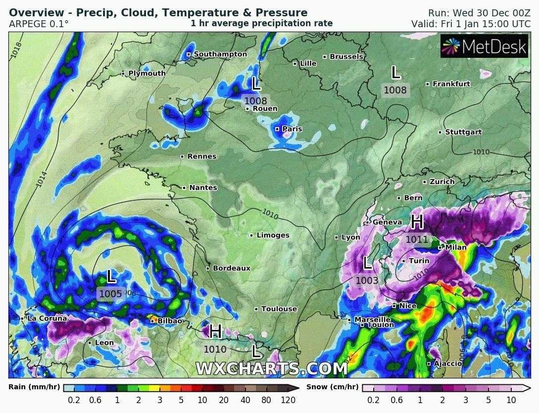 Enfin, soulignons aussi la présence d'un risque d'averses de grésil/grêle et de neige sur les régions bordant la Manche durant la nuit de la nouvelle année. Ce risque semble plus net sur le Finistère.