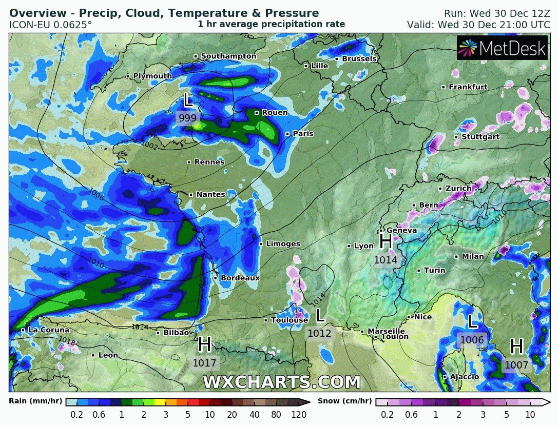 Animation des précipitations le jeudi 31 décembre 2020 jusqu'au matin du Nouvel An - modèle ICON via wxcharts.com