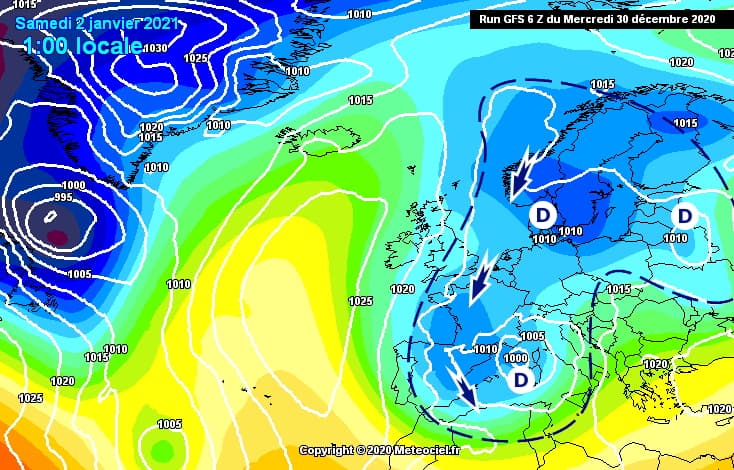 Jusqu'à présent, les basses pressions sont centrées en Mer du Nord et c'est un flux de nord-ouest qui nous concerne. Le froid reste ainsi très modéré en raison de l'origine océanique de ces vents. Toutefois, cette configuration va évoluer en fin de semaine, surtout à compter de la journée du vendredi 1er janvier 2021.