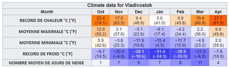 Tableau climatique d'octobre à avril à Vladivostok (Russie) - Wikipédia