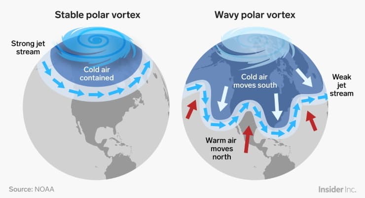 Schéma du vortex polaire en situation stable (à gauche) et instable (à droite) - via Insider Inc.