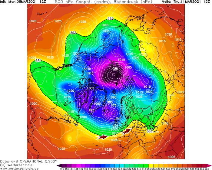 Visualisation du vortex polaire bien plus concentré le 11 mars 2021 - via wetterzentrale