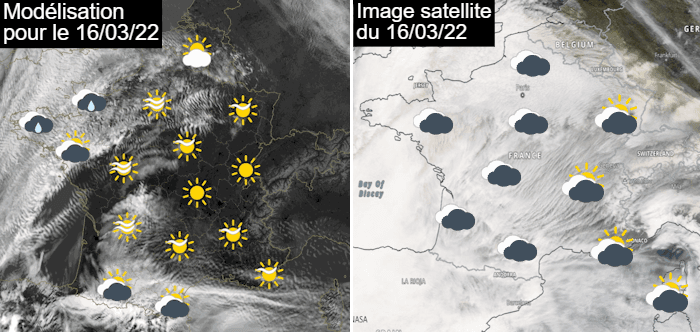 Comparaison entre prévision et observation le mercredi 16 mars 2022 (remontée massive de sable) - meteociel.fr et NASA