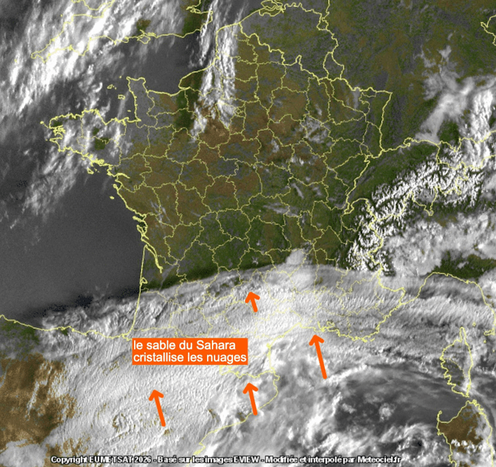 Image satellite mardi 3 mars 2026 avec nuages élevés et sable saharien dans le sud de la France - meteociel.fr