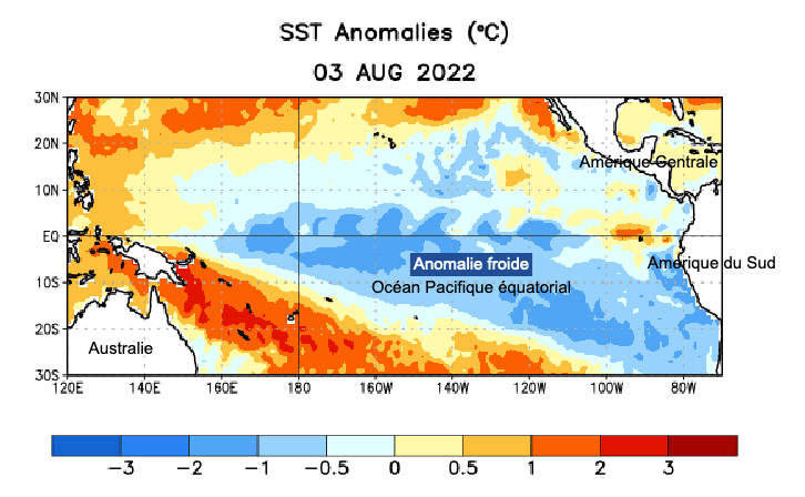 Alors que la température de l'océan Pacifique Équatorial reste bien fraîche, la prévision probabiliste pour ces prochains mois laisse entrevoir une poursuite de cette séquence « La Niña » au cours de la fin d'année 2022, et même jusqu'au début de l'année 2023. Pour la prochaine saison à venir (septembre - octobre - novembre), les chances d'une poursuite du phénomène sont estimées à environ 80%. Ceci diminue pour début 2023 (60% pour la période décembre-janvier-février) avant la fin possible de l'évènement au printemps 2023 (prévision "neutre" majoritaire).