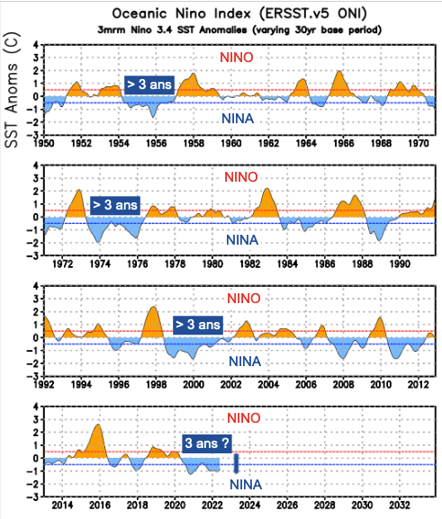 La séquence actuelle La Niña a pour rappel débuté courant août 2020. Si cette prévision se confirme, la durée de ce phénomène pourrait approcher les trois ans consécutifs. Une telle durée est inhabituelle, puisque ceci n'a plus été observé depuis désormais 20 ans, lors de l'épisode La Nina de 1999 à 2002. Ce ne serait que la 4e fois qu'une séquence aussi durable se produit depuis le début de l'analyse du phénomène depuis 1950.