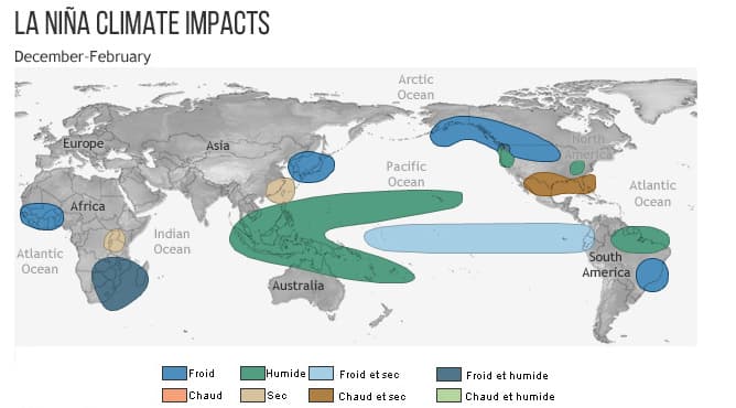 Lors d'un épisode "La Niña", les courants marins sont modifiés et la donne climatique est bouleversée en plusieurs lieux du Globe. En prévision de ce phénomène, et pour l'hiver à venir, nous pourrions observer :