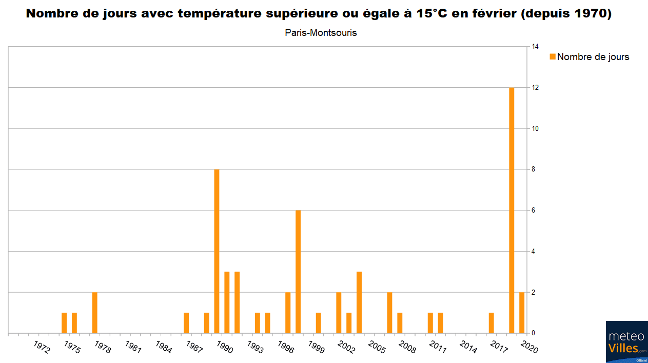 Nombre de jours avec température supérieure ou égale à 15°C en février à Paris-Montsouris depuis 1970 – Météo-Villes