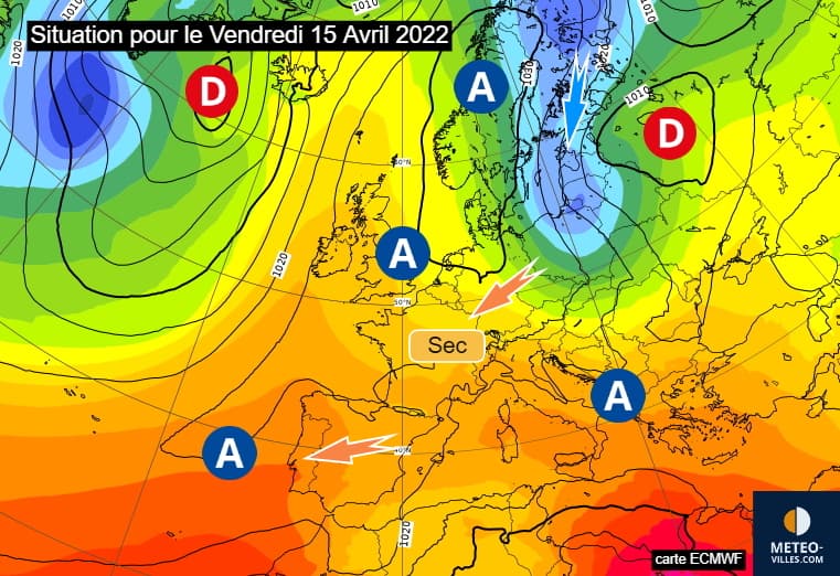 Si les nuages débordent actuellement en marge d'une dépression sur l'Atlantique, une cellule anticyclonique va se renforcer entre les Açores et la Scandinavie à compter du vendredi 15 avril 2022. Le positionnement de ces hautes pressions induira la mise en place d'un flux de nord-est sur l'hexagone pour la fin de semaine, apportant un air sec propice à des journées de plus en plus ensoleillées pour le week-end de Pâques.
