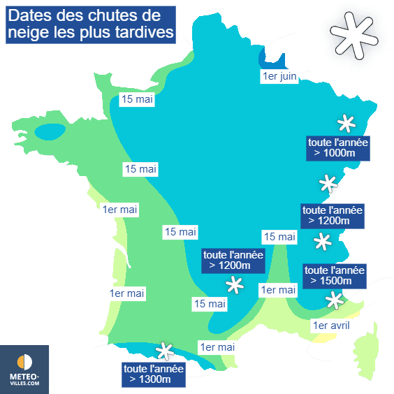 En règle générale, le risque de voir des flocons s'efface dès l'arrivée du mois d'avril sur la côte d'Azur. Il disparaît à la fin du mois d'avril sur les autres régions méditerranéennes ainsi que de la côte aquitaine à la côte vendéenne. Du sud-ouest aux côtes de la Manche, des flocons peuvent être observés jusqu'à la mi-mai. Sur tout le nord, le centre et l'est de la France, on peut encore voir des flocons tomber jusqu'en seconde quinzaine du mois de mai, généralement sous forme de giboulées au sein d'un ciel de traîne alimenté par une coulée d'air froid en altitude. En direction des Ardennes, le risque ne s'efface qu'à l'arrivée du mois de juin.