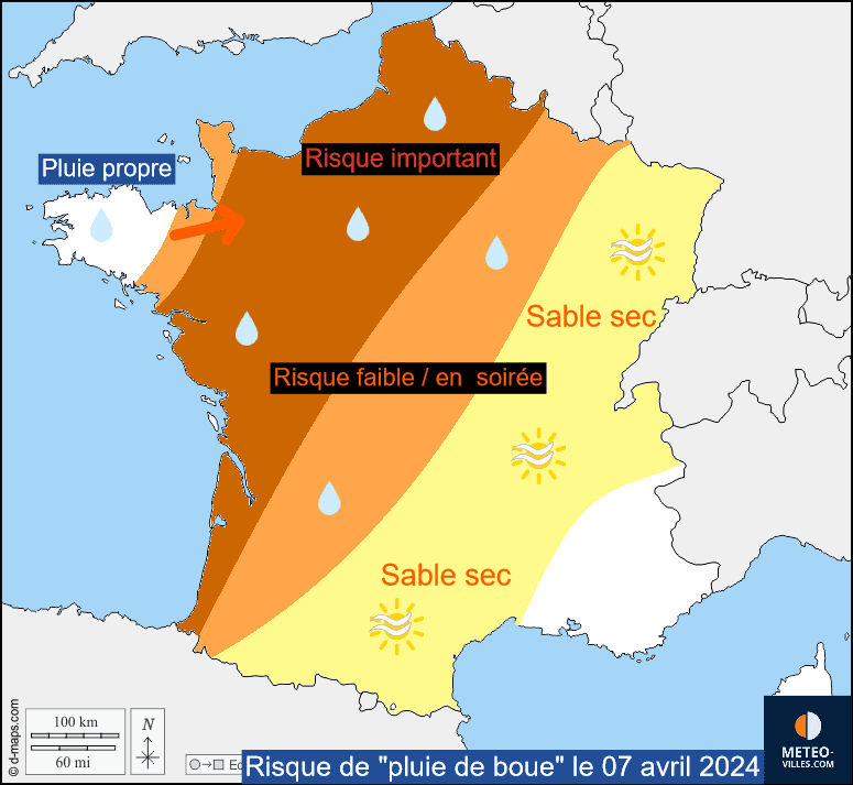 Localisation du risque de "pluie de boue" et du nuage de sable ce Dimanche 07 avril 2024 - MeteoVilles