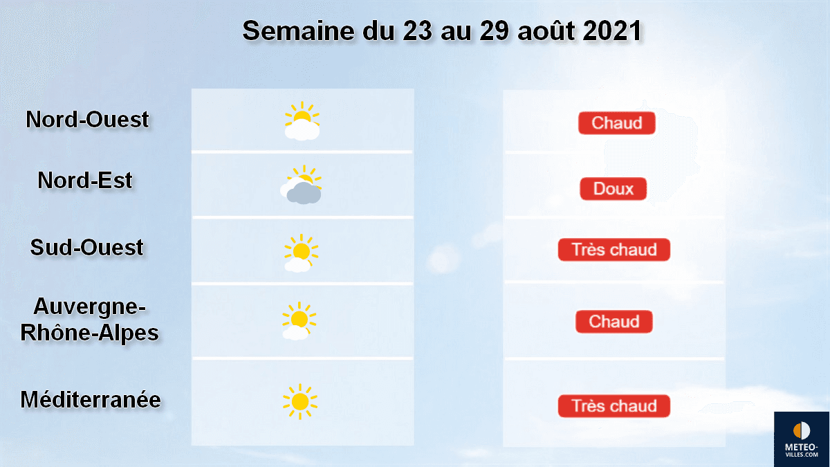 Temps sensible et ressenti prévus pour la semaine du 23 au 29 août 2021 sur 5 régions françaises - Météo-Villes