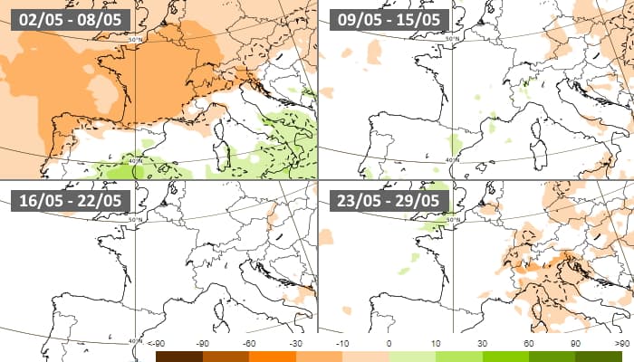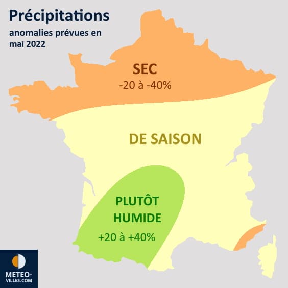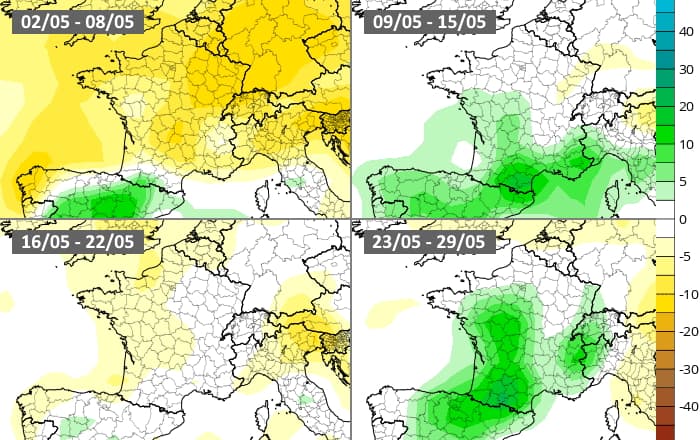 Projection de l'anomalie pluviométrique en France au mois de mai 2022 - Météo Villes