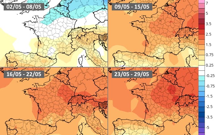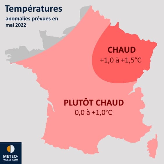 Projection de l'anomalie thermique en France au mois de mai 2022 - Météo Villes
