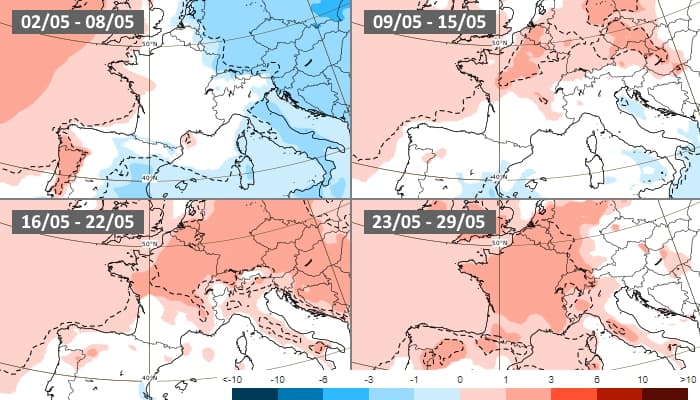 Selon les projections du modèle européen, le début du mois de mai 2022 se déroulerait sous des températures plus ou moins conformes aux valeurs de saison. En revanche, une tendance plus douce semble se dessiner pour les deuxième et troisième décades du mois. C'est d'ailleurs à la fin mai que l'anomalie serait la plus prononcée avec de possibles journées chaudes pour clôturer le printemps météorologique.