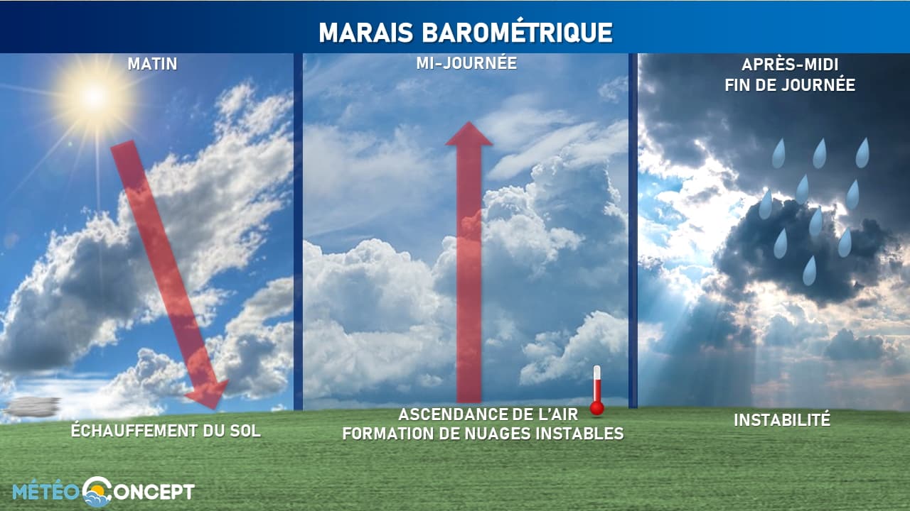 Au printemps, les situations de marais barométrique se traduisent souvent par un temps variable, caractérisé par des matinées souvent plus ensoleillées que les après-midi. En absence de flux bien établi, le soleil réchauffe l'air situé au sol et ce dernier n'a aucun mal à s'élever. Au contact de l'air d'altitude plus frais, les nuages se forment. Les après-midi sont donc plus nuageux et parfois ponctués d'averses voire d'orages. Ces développements instables sont d'ailleurs plus net sur les régions montagneuses où l'air doux s'élève plus rapidement grâce aux reliefs.