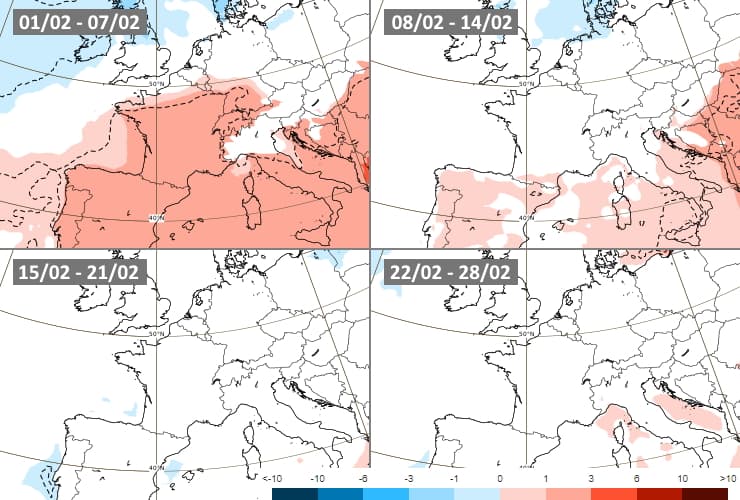 Anomalies thermiques sur les 4 semaines de février 2021 - modèle européen via ECMWF