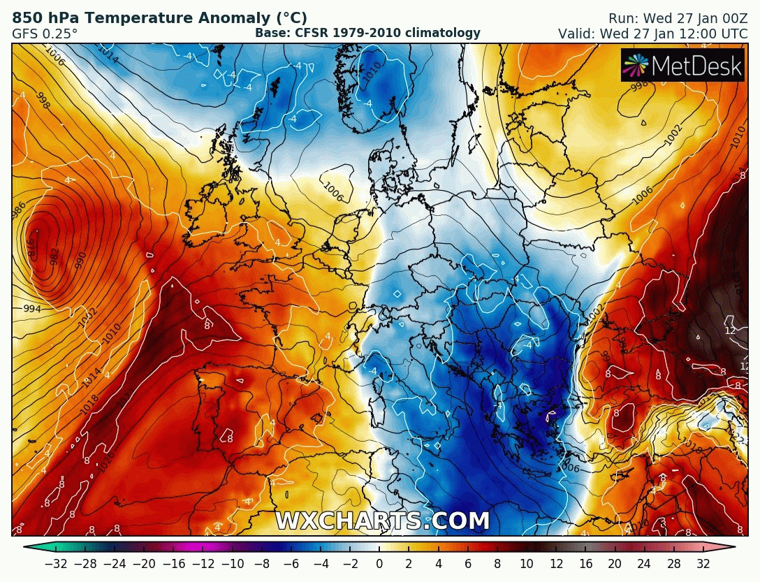 Anomalies thermiques de la masse d'air du mercredi 27 janvier au mercredi 3 février 2021 - via wxcharts.com