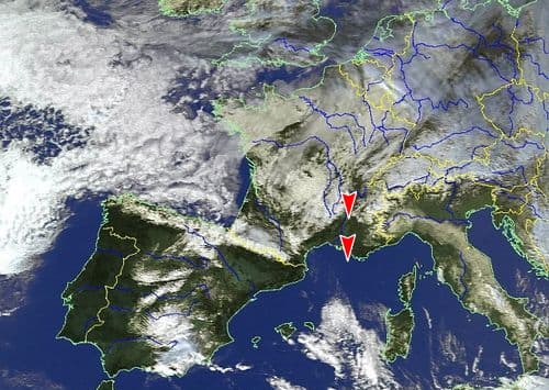 MAIS ATTENTION car ce sont surtout les barrières montagneuses (Pyrénées, Massif-central, Alpes) qui empêchent les nuages d'étage bas et moyens de passer par courant d'ouest à nord (et moins l'effet du mistral et de la tramontane).