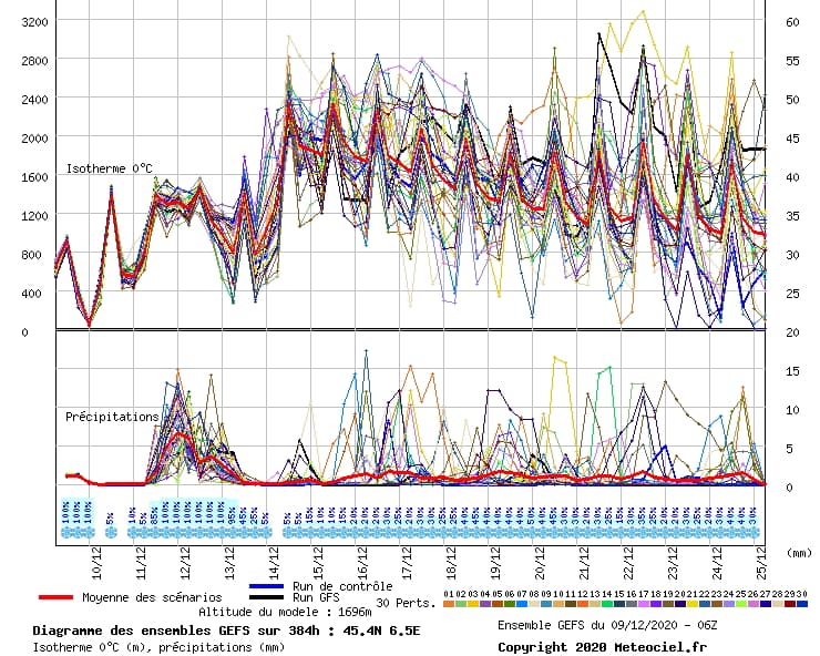 Évolution de l'isotherme 0°C et des précipitations en Savoie jusqu'à Noël - via meteociel.fr