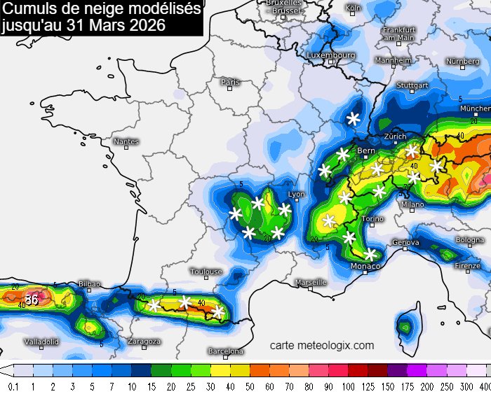 Cumuls de neige modélisés jusqu'au 31 mars 2026 - meteologix.com