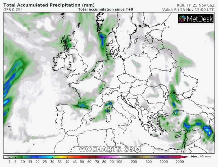 Modélisation des cumuls de pluie en Europe jusqu'au samedi 3 décembre 2022 - via wxcharts.com