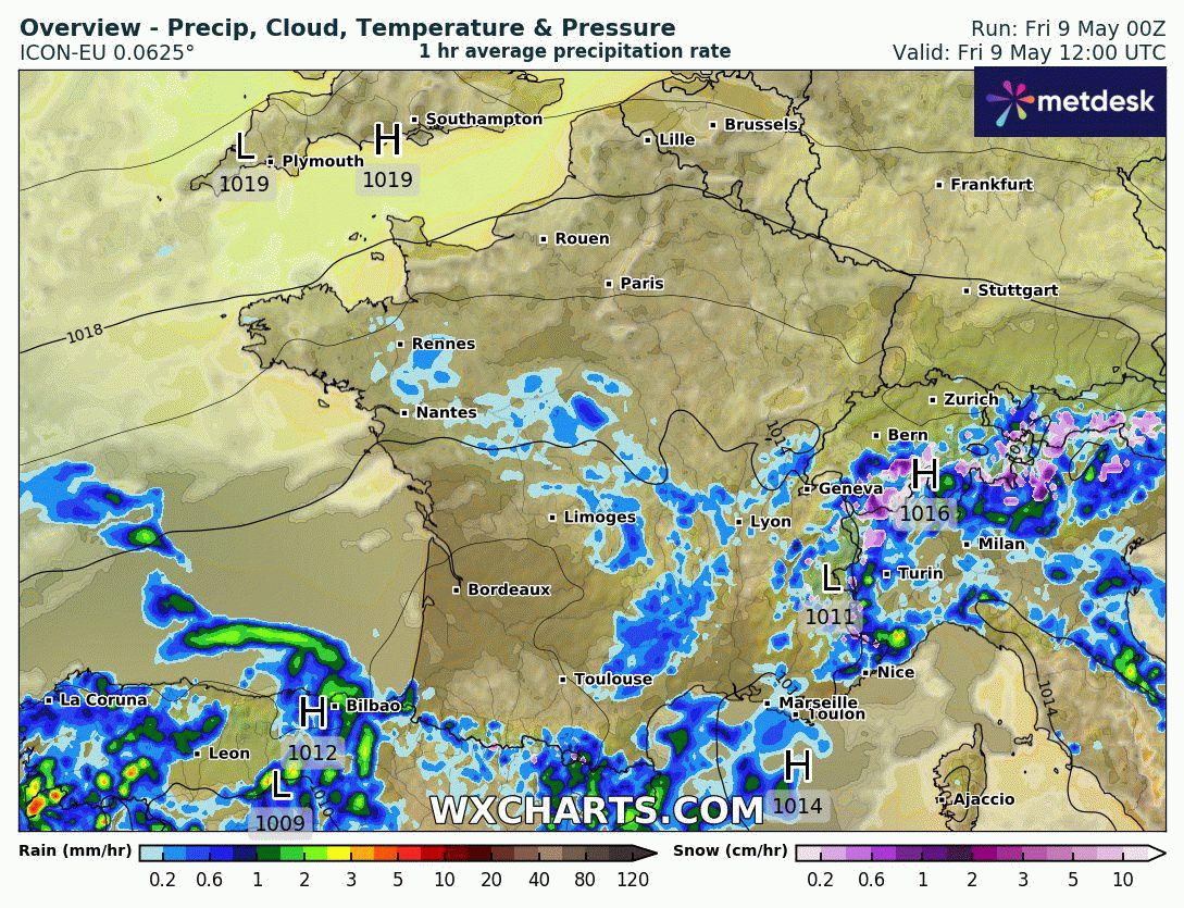 Animation du risque de précipitations sur la France du 9 au 12 mai 2025 – Modèle ICON-EU via WX CHARTS