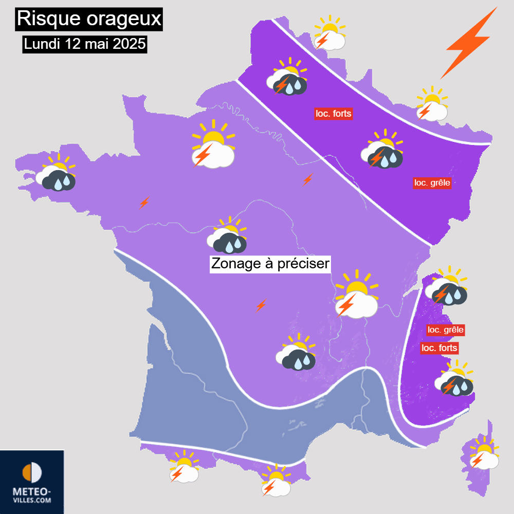 Lundi, de l'air plus océanique s'écoulera sur la France par l'Atlantique, diminuant ainsi le risque orageux sur bon nombre de régions. Néanmoins, un risque d'orages parfois actifs persistera en seconde partie de journée sur une partie du Nord et de l'Est du pays avec là encore un risque de fortes précipitations, de chutes de grêle et de quelques rafales de vent soudaines.