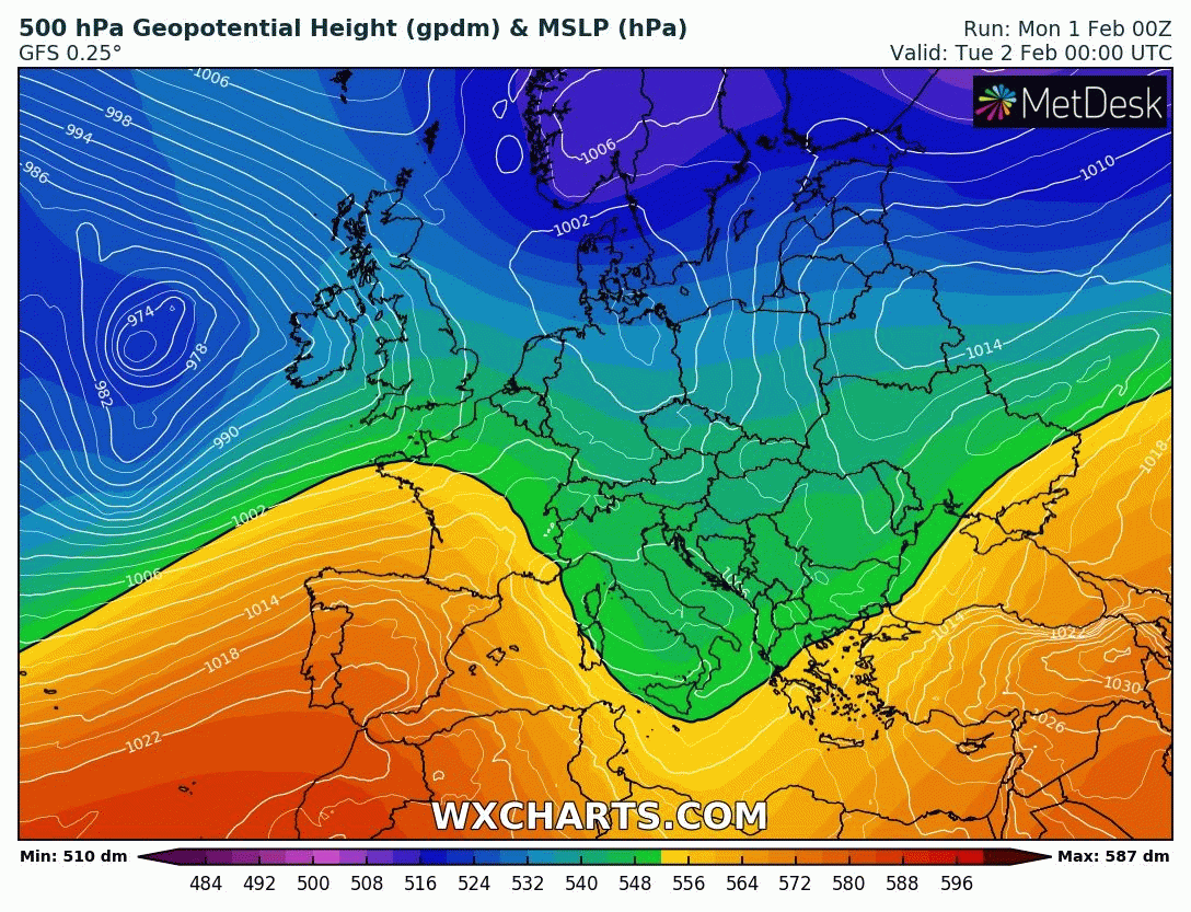Animation de l’évolution des géopotentiels sur l’Ouest de l’Europe entre et Samedi 6 février – Modèle GFS via WX CHARTS