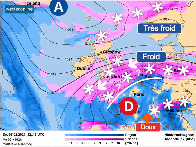 Cette dépression induira un fort conflit de masse d’air sur le pays avec la mise en place d’un flux continental entre les îles britanniques, le Nord de la France et l’Allemagne amenant de nouveau l’air froid scandinave jusqu’à nos portes. A l’avant du centre dépressionnaire le flux resterait orienté au Sud-Ouest avec un air doux persistant possiblement plus longtemps.