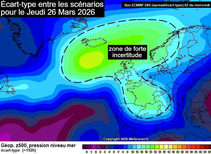 Écart-type entre les scénarios pour le jeudi 26 mars 2026 - meteociel.fr