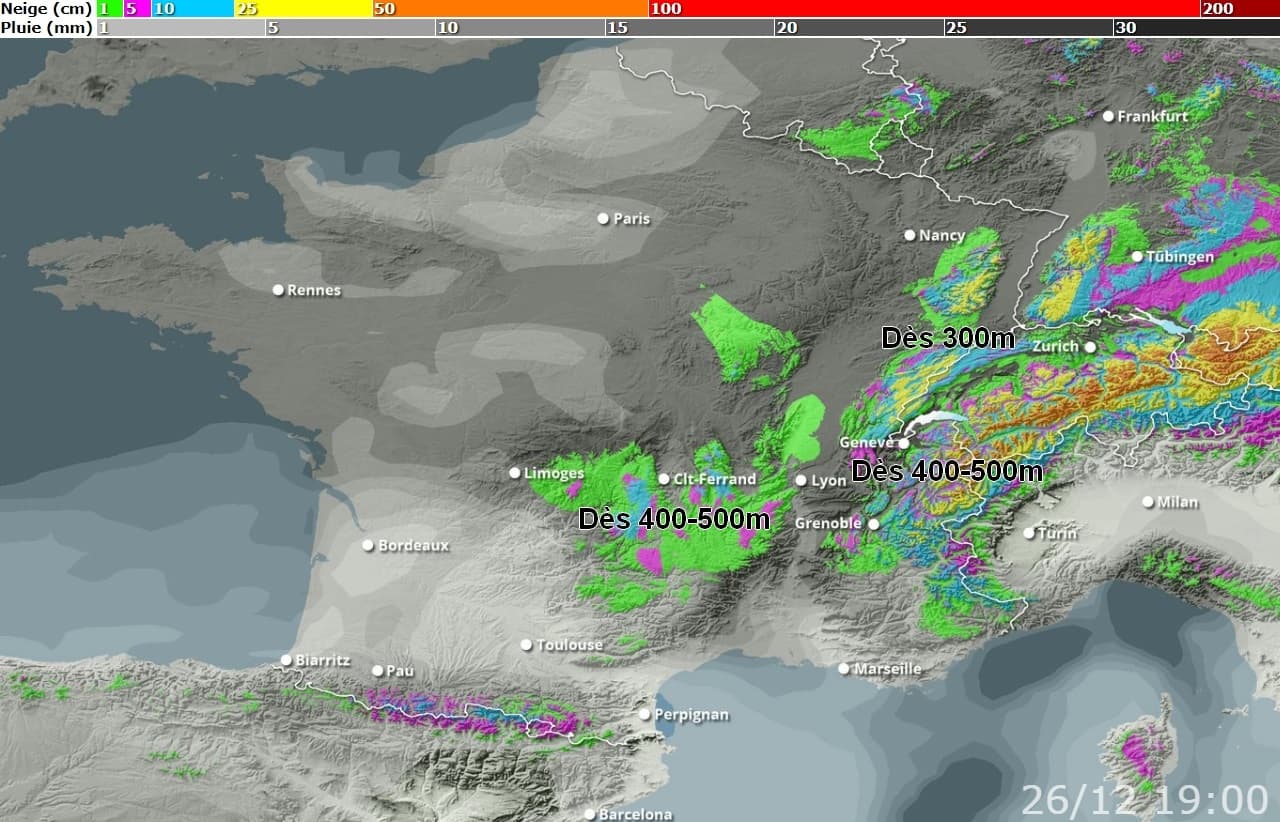 La neige va cependant faire son retour à relativement basse altitude (dès 300-500m) entre le réveillon et le jour de Noël du Nord du Massif-Central aux massifs de l’Est. Si les quantités resteront dérisoires, l’ambiance se montrera hivernale et certaines zones de relief pourront observer un Noël blanc.