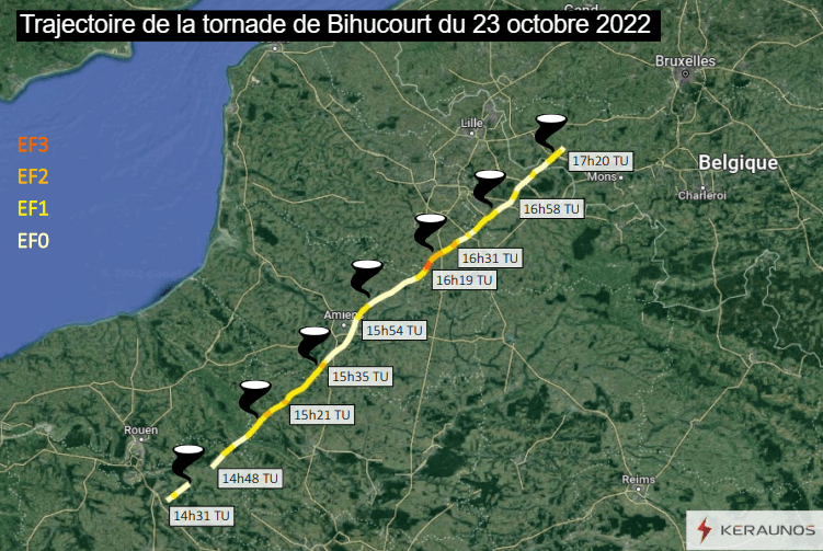 Trajectoire de la tornade de Bihucourt (62) le 23 octobre 2022 – carte keraunos.org