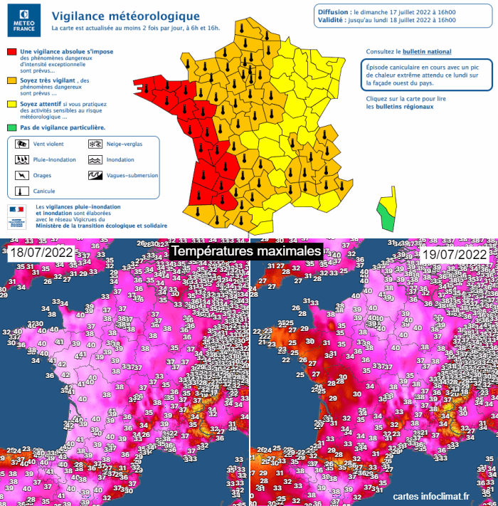 Carte de vigilance et températures maximales en France les 18 et 19 juillet 2022 - Météo France & infoclimat.fr